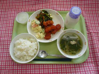 *今日の副菜はひじきをゆでてしょうゆで下味をつけ、キュウリ、人参、ハム、チーズとドレッシングで和えた物です。ひじきは海に中にはえる植物の仲間で、干した物を水にもどして煮るとねばりが出ておいしくなります。保存がきくので昔から家庭でもよく使われていました。鉄分やカルシウムが多く含まれます。鉄分は血を作る大切な働きがあるのでたくさん食べましょう。
