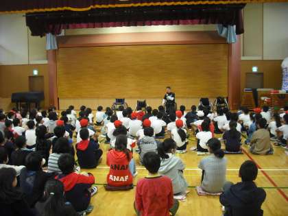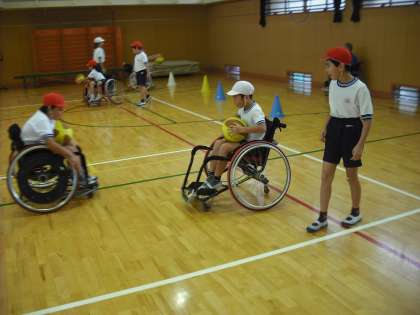 パラリンピックの競技種目、車椅子バスケットボールについて講演をしていただき、車椅子バスケットボール体験を行いました。