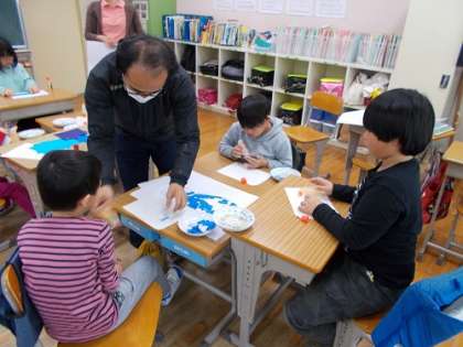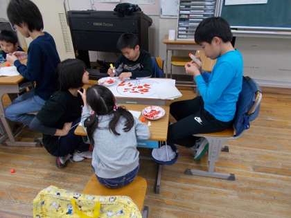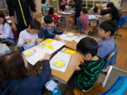 児童がアイディアを出して、赤は「トマト、いちご、消防車」青は「イロブダイ、ブルーハワイ、しおからとんぼ」黄色は「パイナップル、星、稲妻」の貼り絵をしました。