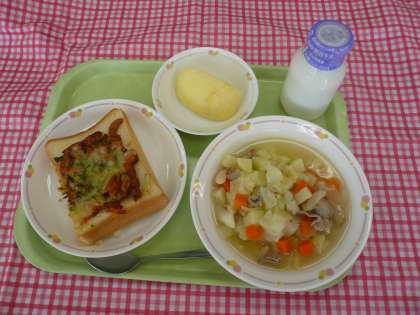 *今日のピザトーストは1年生のリクエスト給食です。スープはインゲン豆を使ったスープです。インゲン豆は種類が多く、金時豆、手亡、うずらまめ、虎豆、大福豆などがあります。世界中で日常的に食べられている豆のひとつです。日本への渡来は17世紀中頃、中国から隠元禅師によってもたらされ、禅師の名にちなんで隠元豆とよばれるようになりました。