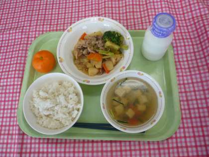 *今日は1年生のリクエスト給食で肉じゃがでした。おつゆの雷汁とは、水気を切った豆腐をくずしながらごま油で炒め、大根や人参などの野菜をいれた汁物です。熱した油で豆腐を炒めるとき、バリバリ雷のような大きな音がすることからこの名前がついたそうです。