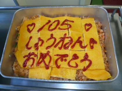 *今日は明日の105周年記念式典をお祝いした給食です。各クラスのごはんバットに入れたオムライスの卵焼きの上におめでとうのの文字をケチャップで書いてお祝いしました。