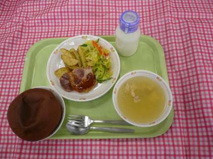 *今日は12月に行った平成スペシャル集会で当選した人が選んだリクエストの給食でした・ポークソテーのリクエストでした。スープのミルファンティというのは、イタリア料理で、チーズ入りのかきたま汁です。イタリアのナポリの近くにある町の郷土料理がオリジナルです。野菜などのスープに割りほぐした卵と粉チーズとパン粉をまぜたものをかきたまのように入れます。