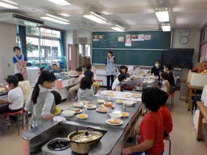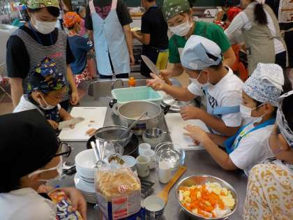 5つの班にわかれて、シチュー、サンドイッチ、ゼリーを作りました。