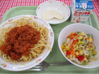 今日の「スパゲティミートソース」は、たけのこ学級のリクエスト給食です。たけのこ学級だけでなく、子どもの好きなメニューなので、喜びの様子がたくさんみられました。