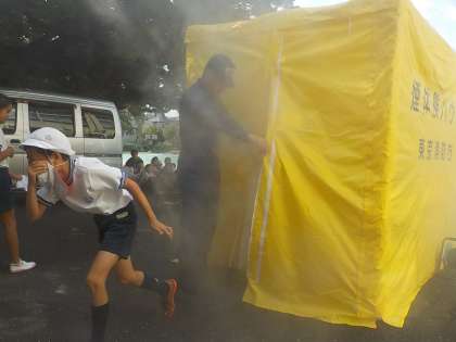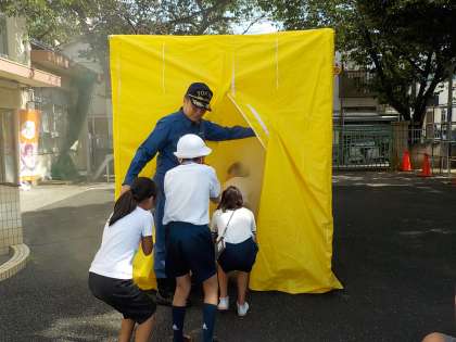9/20(金)に豊島消防署の方を招き、煙体験を行いました。火災などで煙が発生した際には、ハンカチで鼻と口を押さえ、姿勢を低くして、壁や床を手で触りながら移動することを学びました。