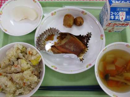 今週金曜日(10月11日)が十三夜なので、今日は一足早く「十三夜献立」です。十三夜は、9月の十五夜とともに、秋の収穫に感謝をして、収穫したての農作物をお供えし、お月見をする日です。今日は、秋に旬を迎える野菜などをたくさん使った献立です。秋いっぱいごはんには、きのこやぎんなん、栗などが入っています。