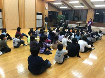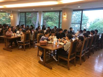 2日目は、少し霧雨が降っていたので秀山荘の中での朝会になりました。今、朝ごはんを食べ終わったところです。