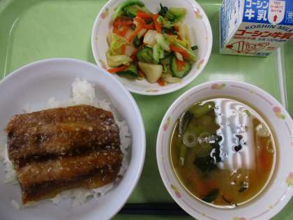 今日は、さんまの蒲焼き丼です。今日は、下味をつけたさんまを揚げて、甘めのたれをかけました。他のおかずより蒲焼き丼がおいしかったようで、「お魚おいしい。」という感想をたくさん聞くことができました。