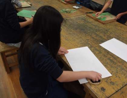 6年生の図工では、生物の形の面白さを生かしたデザインを考え、版画をつくっています。これまでの経験を生かし、計画的に彫ることができています。