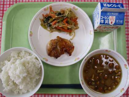 今日の副菜は、野菜のごまだれです。甘酸っぱい味付けで、どんな主菜にも合う味の副菜です。あるクラスの児童が、野菜が苦手で量を減らして食べていましたが、食べてみるとおいしかったようで、減らした分を増やして食べてくれていました。