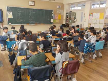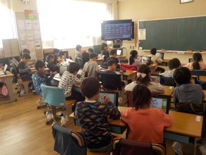 1年生はタブレットPCを使ってカレンダーを作りました。