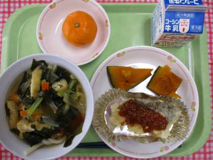 今日は、リザーブ給食です。今回は、ホキのごまみそ焼き(焼き料理)かホキのチリソース(揚げ料理)からひとつ選びました。どちらを食べるかは事前にアンケートを取り、予約していました。予約結果は、児童と教職員合わせて ごまみそ焼きを予約した人165人、チリソースを予約した人220人でした。