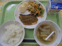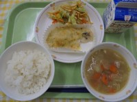 ご飯白身魚のふわマヨ焼き芋入りサラダ野菜スープ牛乳今日は、白身魚にマヨネーズ・生...