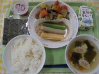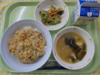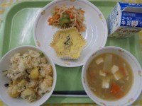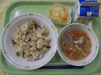吹き寄せご飯ひじき入りたまご焼き野菜の梅和え豚汁牛乳今日は、秋が旬の栗・さつまい...