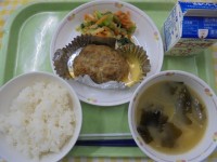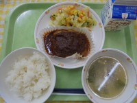ご飯トマト煮込みハンバーグフレンチサラダかぶとベーコンのスープ牛乳今日は、ふわふ...