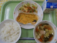 スープカレーコーン入りサラダかぼちゃプリン牛乳今日は、北海道が発祥のスープカレー...