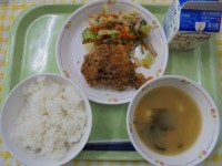 ごはんかわりチキンカツ和風サラダ味噌汁牛乳今日は、カレー味のかわりチキンカツを作...