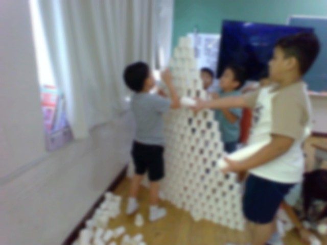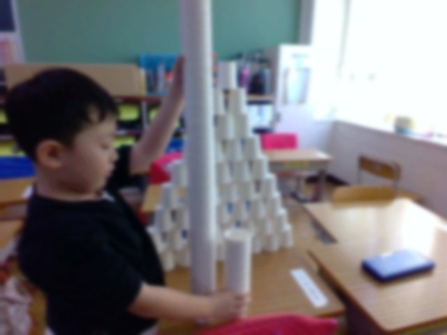紙コップを使って活動を楽しんでいました! 教室には紙コップがたくさんあり、まさに紙コップルーム!