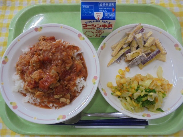 今日は、人気のさつまいものかりんとう風を作りました。秋といえば、さつまいも!という事で、まだ暑い日が続いていますが、給食からちょっぴり秋を感じてもらいました。