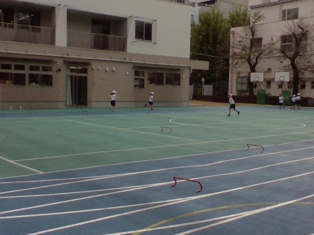 障害物を使った走る運動をしていました。