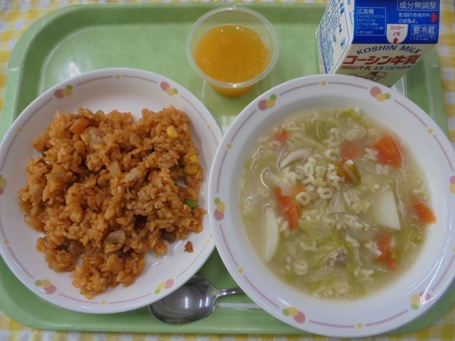 今日は、お馴染みの「豊成セット」給食です。手慣れた様子で、パパっと配膳をして食べ始めていました。