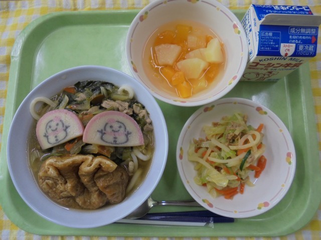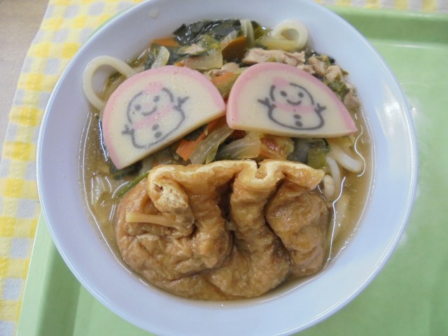 今日はお正月と1月11日の鏡開きにちなんだ行事食を作りました。鏡開きは、お正月に年神様にお供えした鏡餅を下げ、割って、食べ、1年の無病息災を願います。今日は、油揚げに1つ1つ餅を詰め、甘辛く煮込んだ手作りの餅巾着にしました。子ども達は、もちもちのお餅をよく噛みながら、おいしそうに食べていました。また、年明けうどんの具として、雪だるまかまぼこを入れましたが、あちらこちらから、「雪だるま、可愛い!!」という声が聞こえていました。