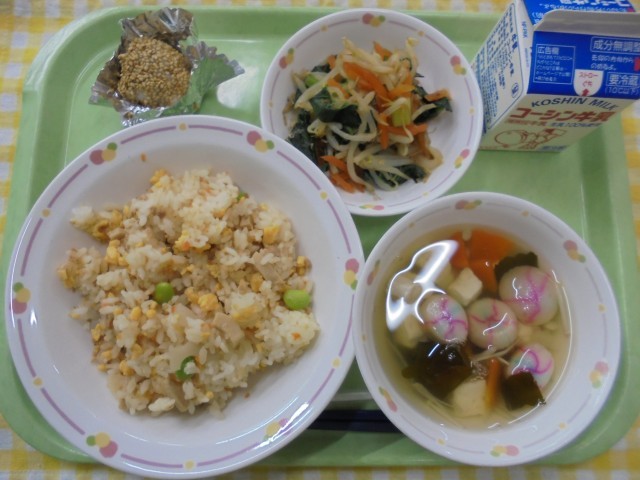 今日のごま団子は、給食室の手作りです。白玉粉と上新粉を合わせた餅生地で、あんを包み、ごまをまぶして焼き上げました。オーブンの扉を開けると、ごまの香ばしいかおりが、給食室中に広がりました。