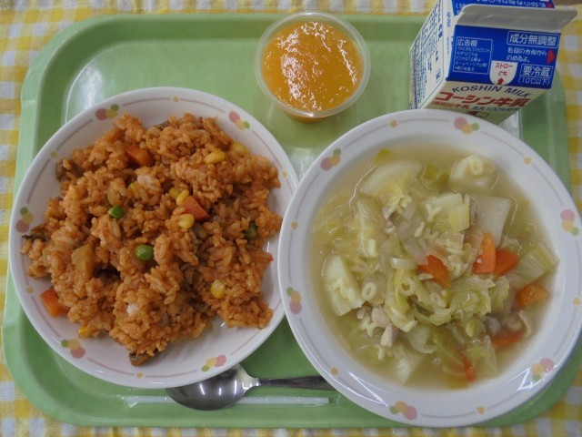 今日は、お馴染みの「豊成セット」給食です。いつも人気の献立ですが、今日も寒さの厳しい1日だったので、温かくボリュームもあるABCマカロニスープがいつも以上に人気でした。