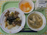 1/24〜30は全国学校給食週間です。それに合わせ、今週の給食はいつもの給食とは違った特別献立が日替わりで登場します。今日のテーマは「昔の給食を食べてみよう!①」で、今日は、明治〜昭和初期にかけての給食です。小麦粉と白玉粉を混ぜて作った「すいとん」は、もちもち・ぷるんとしており、子ども達もおいしそうに食べていました。