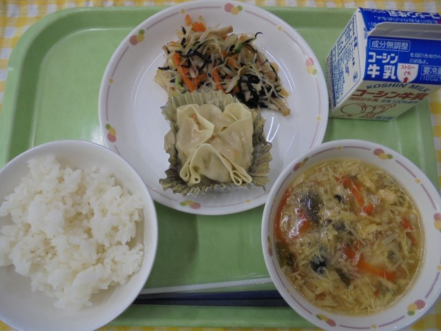 今日は、ボリュームたっぷりの手作りしゅうまいでした。直径12cmの大きなしゅうまいの皮で具を包んで、蒸しあげています。どのクラスも「しゅうまいのお代わり、食べたい人?」の声に、多くの子が手を挙げていました。