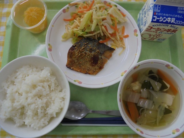 今日は、脂ののった鯖に、味噌ベースの下味を漬け込んで焼いた、さばのごま味噌焼きを作りました。ご飯の進む味付けで、どの学年もよく食べていました。また、丸ごとみかんが入ったゼリーも食べ応えがあり、大人気でした。