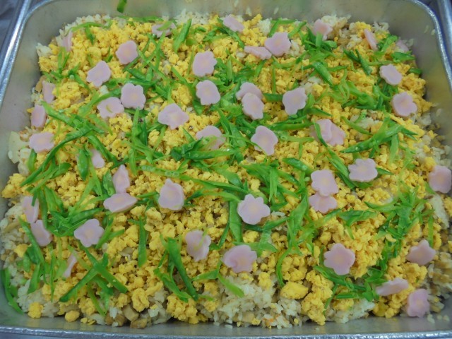 今日は見た目も華やかなひな祭り献立です。食缶を開けると、春らしい色合いのちらし寿司が広がり、「わぁ!すごい!」「とってもきれいだね!」という声が聞こえてきました。目からも舌からも楽しめた給食になりました。