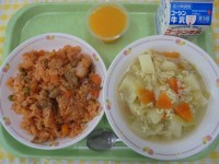 チキンライスABCマカロニスープつぶつぶオレンジゼリー牛乳今日は、おなじみの【豊...