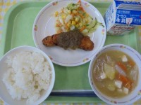 ご飯魚の竜田揚げコーンサラダ春野菜の豚汁牛乳今日は、新玉ねぎ・新じゃがいも・春キ...