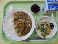 ポークカレーじゃこ入り海藻サラダぶどうゼリー牛乳今日から1年生も給食がスタートし...