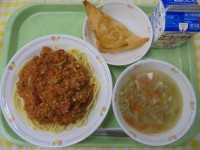 ミートソーススパゲティジュリエンヌスープゆうたろうのアップルパイ牛乳10月の給食...