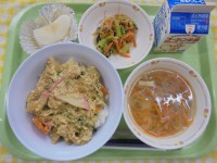 あぶたま丼ごま和え沢煮椀梨牛乳今日は、油揚げを玉子でとじた「あぶたま丼」です。厚...