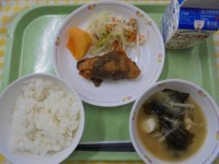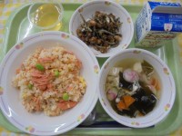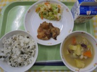 わかめご飯鶏肉の生姜焼きカリカリサラダさつま汁牛乳今日は、すりおろし玉ねぎ・生姜...
