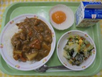 あとのおたのしみカレーじゃこ入り海藻サラダおかしな目玉焼き牛乳今日は、おはなし給...