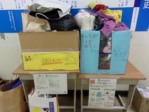 6年生は、ユニクロ・GUが行っている「服のチカラ、プロジェクト」に参加をし、不要になった子供服を集めています。近隣の保育園に伺って協力をお願いしたり、校内では放送や動画で呼びかけたりしています。10月17日(金)から回収を開始していますが、すでに多くの洋服が集まっています。10月31日(金)まで回収を続けていきます。ご協力ありがとうございます。