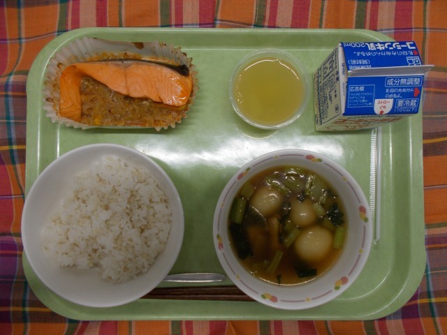 今日は、北海道の郷土料理です。いもだんご汁は、給食室でじゃがいもを蒸した後、つぶして一つ一つていねいに丸めました。もちもちしておいしいです。