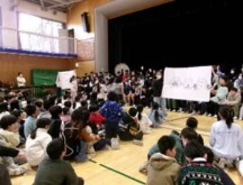4年生は、6年生を送る会で、6年担任の「先生の思い出キャンバス!何を描いているでしょうか?」クイズを行いました。「6年担任の先生が描いた絵は何か。」を6年生に考えてもらい、会場は大いに盛り上がりました。