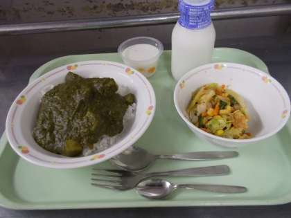 インドでは、今日のようにほうれん草を使ったカレーは普通に食べられています。日本ではほうれん草をカレーに使うのは珍しく、色も緑色なのでちょっとびっくりするかもしれませんね。味はとてもおいしいので、まずは一口、食べてみてください。