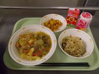 今日はリザーブ給食です。みなさんには2種類の飲み物からひとつを選んでもらいました。「ジョア」を選んだ人は骨や歯をつくるもとになる カルシウム、「りんごジュース」を選んだ人は体の調子を整えるカリウムという栄養素をとることができます。