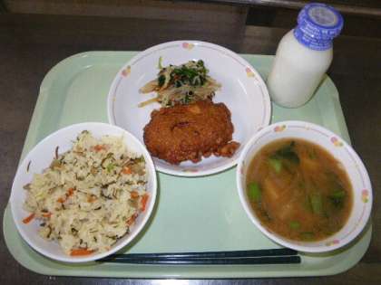 今日はにんじん、ごぼう、ねぎ、いかの角切りも入れたボリュームたっぷりのさつま揚げです。ひとつひとつ給食室で手作りしました。