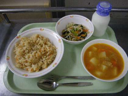 今日の献立に入っているミネストローネはイタリアの家庭的なスープの一つです。6年生のリクエスト給食では、揚げパンなどパン類と組み合わせて考えてくれた人が多かったスープです。揚げパンは別の日に登場しているため、今日はツナピラフと組み合わせています。