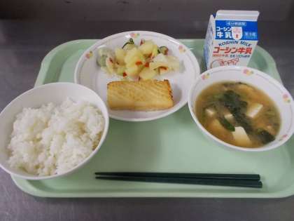 今日のおかずはしょうが、にんにく、ねぎを混ぜた香味味噌にいかを漬けて焼いた「いかの香味焼き」と、じゃがいも、たまねぎ、きゃべつなど、春野菜をたっぷり使った「じゃがいもサラダ」です。春野菜のみずみずしさ、ほんのりとした甘さを味わってください。