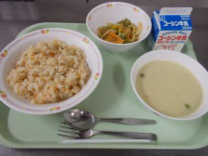 今日のポタージュに入っているグリンピースは、2年3組の皆さんがさやむきしてくれたグリンピースです!旬を迎えたグリンピースは甘みとうま味がたっぷりなので、今日はうま味を特に感じられる、ポタージュにしました。