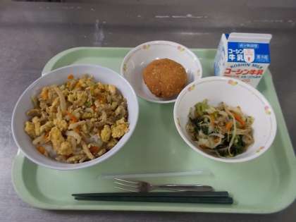 今日のデザートは「おから」が入ったドーナッツです。「おから」は大豆から豆腐を作る途中に出来る、大豆の絞りかすです。お腹の調子を整える食物繊維や体をつくるもとになるたんぱく質を含んでいます。
